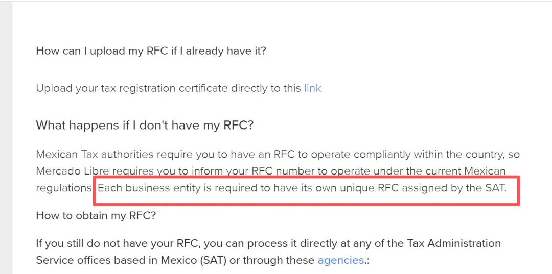 墨西哥税务机关要求在墨运营的企业必须拥有RFC,因此 Mercado Libre(美客多)要求你提供RFC编号,才能符合墨西哥现行法规。