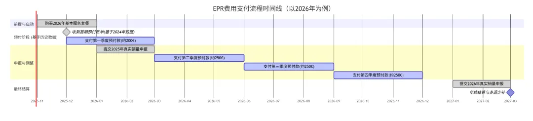 ◆金额如何计算:此时您2025年的真实销量还未申报,回收公司会参考您2024年的金额(800欧),平均到四个季度。