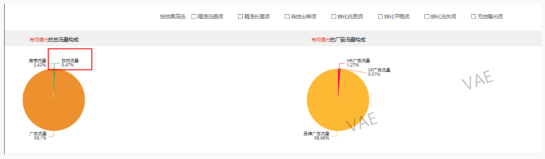 从下图可以看到,自然流量占比只有0.47%,大部分都是广告流量。而且广告流量中品牌广告流量占比了98%以上。实际上呢,我们SP广告投放比例也不算低,但是从数据呈现SB的广告流量是远高于SP广告流量。当然我们这个产品也是做成功的了,依靠广告流量(流量词)的策略做起来了。