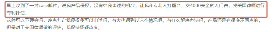 近日,有卖家反馈自己收到一封亚马逊case邮件,内容为产品侵权,但没有给申诉机会,而是要求他交4000美元去和专利权人“打擂台”,如果不在规定时间内交钱,产品将会被强制下架。