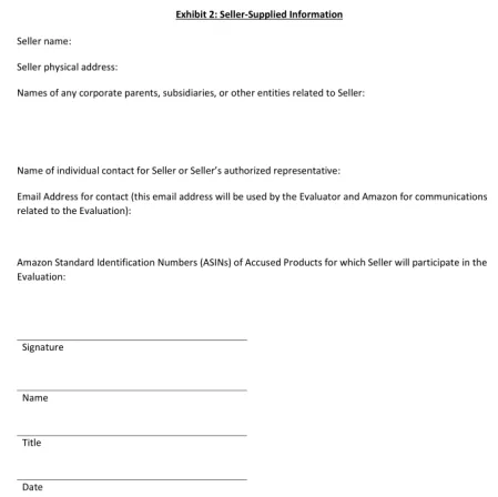 亚马逊收到协议后,会将该协议发给被控侵权的所有卖家,要求他们在3周内签署并填写好附录2后,并返还协议。如若有卖家在3周内没有返还协议,亚马逊将会强制删除listing。