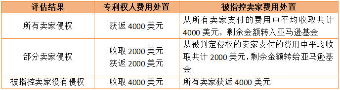 评估者选定后,专利权人和被指控卖家需要在2周内各支付4000美元。如若专利权人未按时付款,评估人将会返还卖家支付的4000美元;若是卖家未按时支付,亚马逊将会强制删除被指控listing。