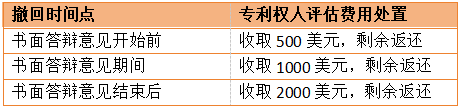 评估者根据撤回时间点保留专利权人支付的500、1000、2000美元,被指控卖家费用全部返还。