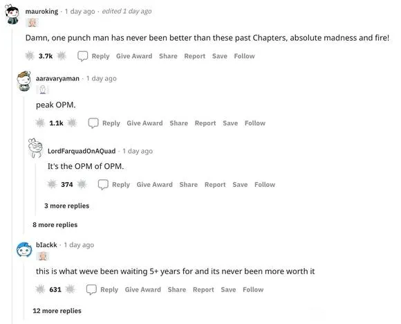 2015年播出的《一拳超人》第一季,在欧美漫画网站票选,就以47%得票率登顶最佳动画。今年更新的211话,虽然在国内评价不佳,但在X上被盛赞“best chapter”,在Reddit上,一条“一拳超人从来没有像过去这几话这么精彩过!”的评论获得了3700个赞。