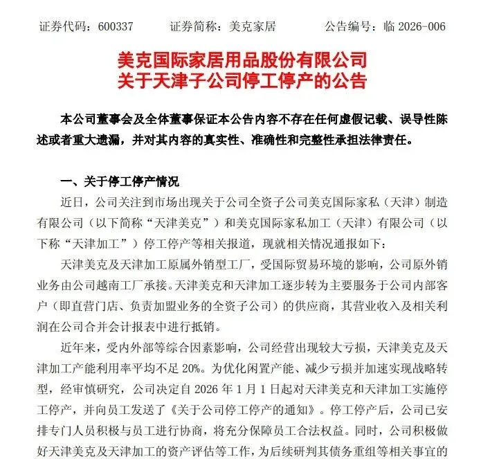 近日,美克国际家居用品股份有限公司正式公告,其位于天津的两家重要全资制造子公司——美克国际家私(天津)制造有限公司和美克国际家私加工(天津)有限公司,已于2026年1月1日起全面停工停产。