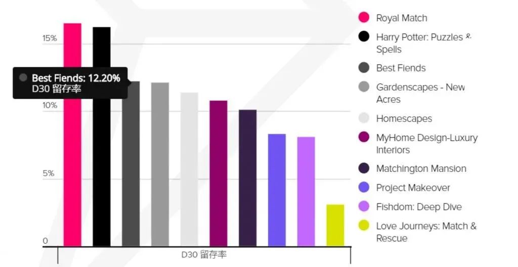 数据显示今年的第三季度,一款名为《Best Fiends》的手游凭借 12.2% 的 30 日留存率,在三消品类中排名第三,仅次于《Royal Match》和《Harry Potter : Puzzles & Spells》。