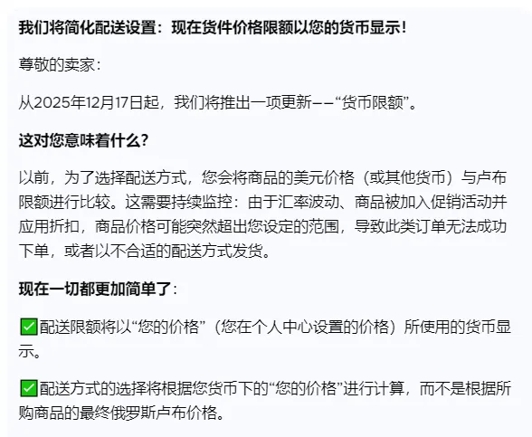 尊敬的卖家:从2025年12月17日起,我们将推出一项更新——“货币限额”。