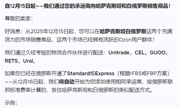 从2025年12月15日起,您可以在哈萨克斯坦白俄罗斯这两个充满活力的市场销售商品,这两个市场已经拥有活跃的Ozon用户群体!