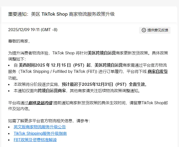 自美西时间2025 年 12 月 15 日(PST)起,美区跨境自运营商家需通过平台官方物流服务(TikTok Shipping / Fulfilled by TikTok (FBT)) 进行订单履约,平台将下线 商家自发货 功能。