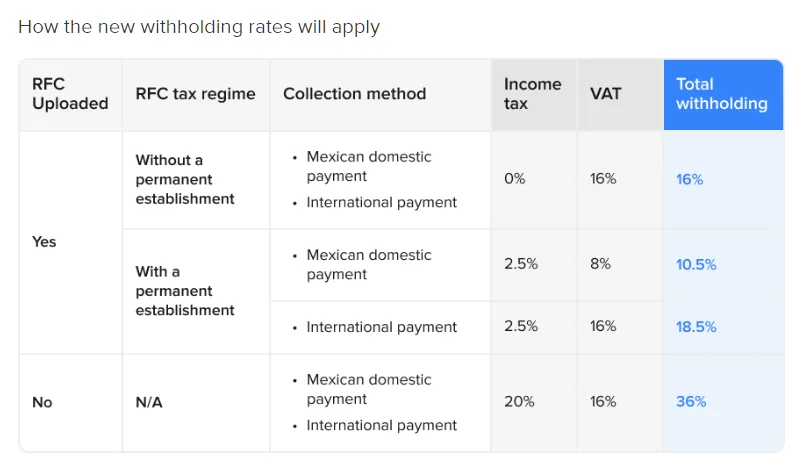 自 2026 年 1 月 1 日起,墨西哥新的税收法规将改变您销售的预扣税率,引入所得税预扣制度,并更新数字平台销售的增值税预扣税率。此规定仅适用于所有在墨西哥境内存储的产品的销售。