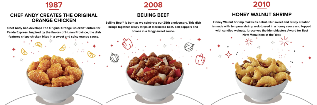 如今的 Panda Express 经历了漫长的发展过程。Panda Express 最初是由更加传统的 Panda Inn 演变而来。1973年,创始人程正昌和父亲一起开设了 Panda Inn,主营传统中餐。1983年,程正昌和妻子蒋佩琪开设了第一家 Panda Express,将中餐和快餐结合到一起,自此走上了中式快餐的快车道。在口味方面,Panda Experss 针对市场做了改良,其标志性菜品——橙子鸡、北京牛肉和蜂蜜核桃虾——在中国国内并不常见,成为美式中餐的特色代表。