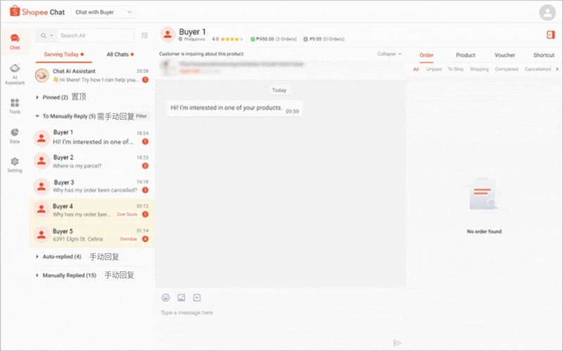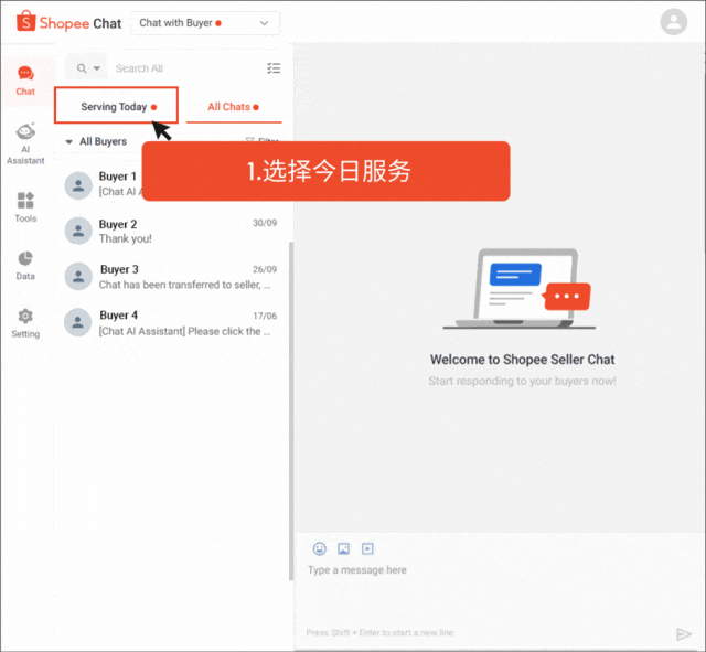 在 Shopee 网页聊天中,这些聊天记录可以在今日服务和所有聊天中查看: