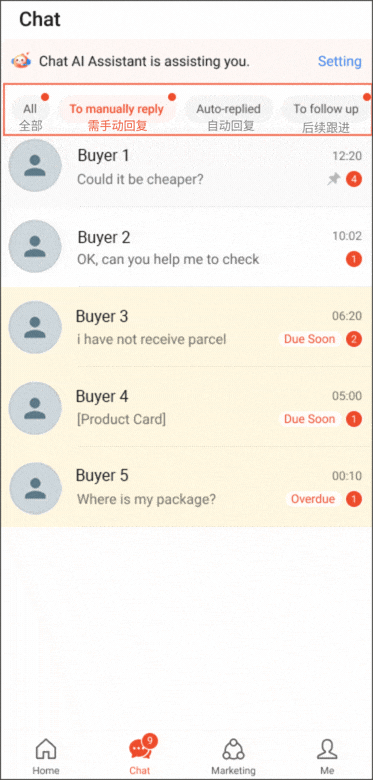 在卖家应用程序中,选择全部或手动回复聊天筛选芯片后,即可看到即将到期/逾期标签。