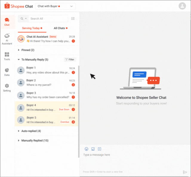 当您在 Shopee App、卖家中心和 Shopee 网页版中使用 Shopee 卖家聊天功能时,您可以轻松便捷地管理您的聊天记录。