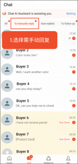 1. 手动回复 - 指需要手动回复的买家聊天记录。这是默认文件夹,以确保不会错过重要的对话。