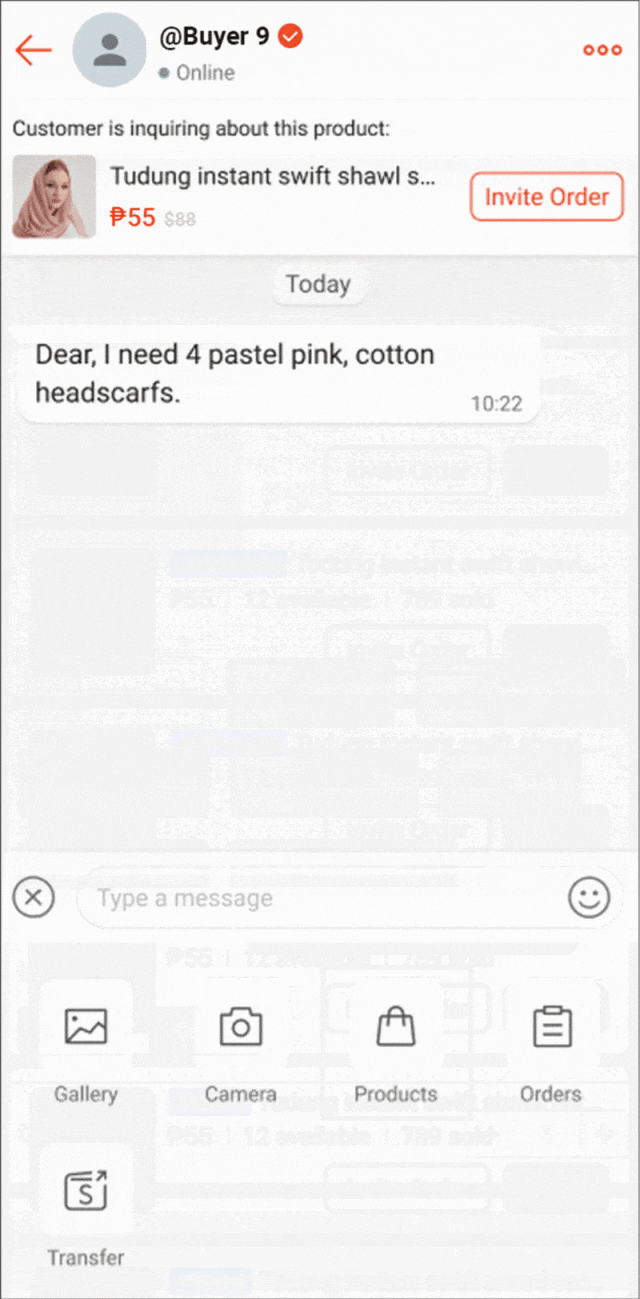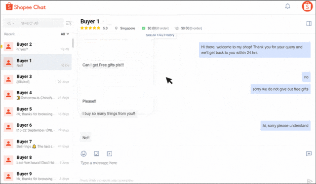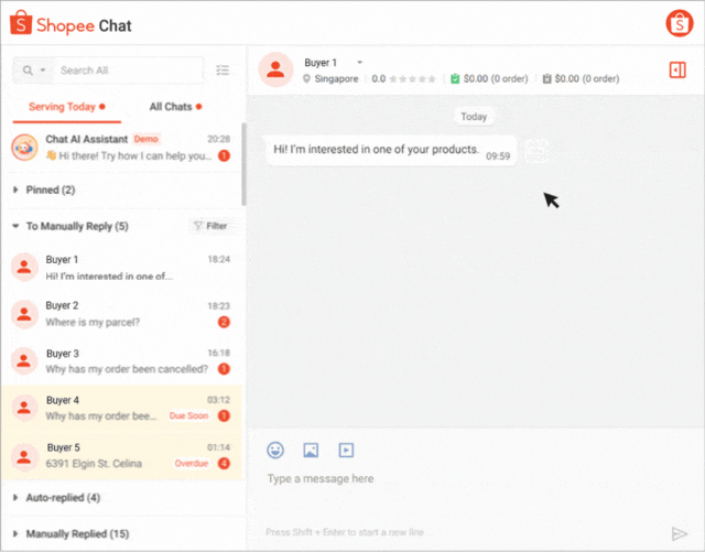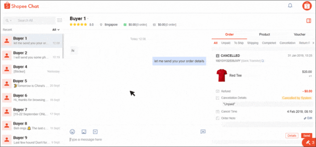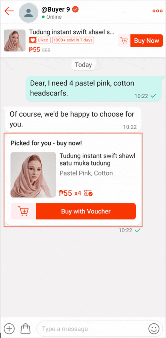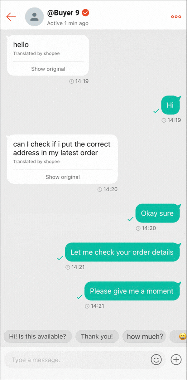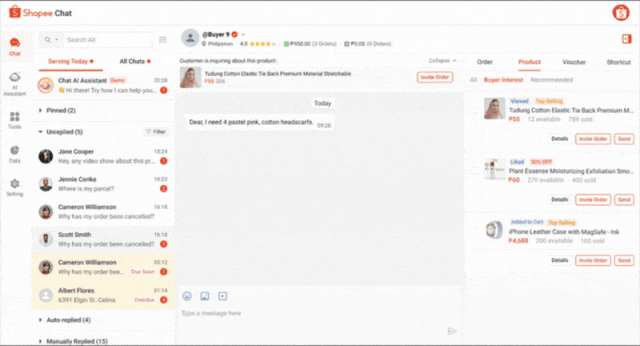 您可以通过 Shopee 卖家聊天邀请买家购买您的产品;这可以简化购买流程,从而改善买家的体验,并提高订单转化率。