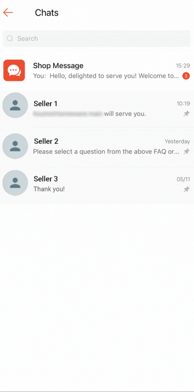 在卖家应用程序中,在选定的聊天记录上向右滑动,然后选择置顶。