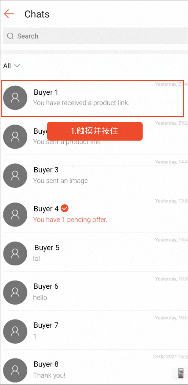在 Shopee应用程序上,触摸并按住消息,或在消息上向左滑动。