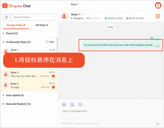 在卖家中心和 Shopee 网页聊天中,将鼠标悬停在聊天中的相关消息上,然后选择回复按钮。