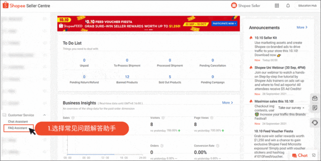 在卖家中心,选择侧边栏菜单中的客户服务,然后选择常见问题解答助手。您可以在此处管理以下 3 个类别的常见问题解答: