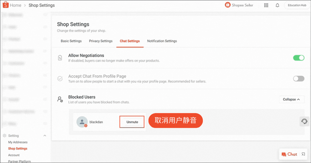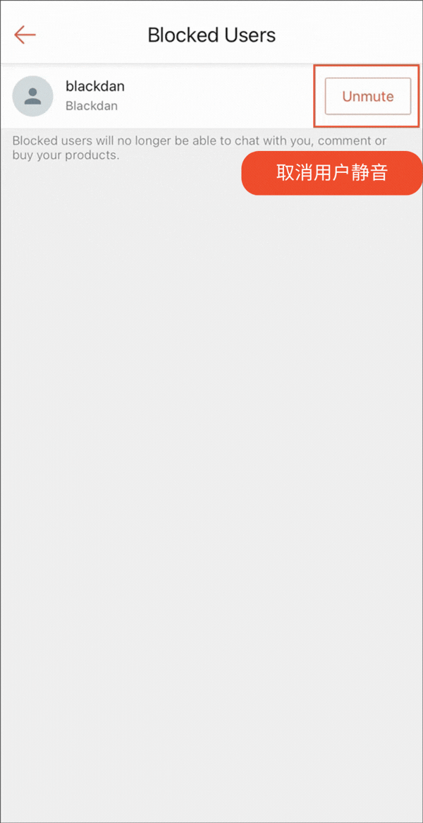 您可以取消屏蔽用户以继续发送或接收消息。在 Shopee App 或卖家中心重复查看屏蔽用户清单的步骤,然后取消禁言(Unmute)该用户。