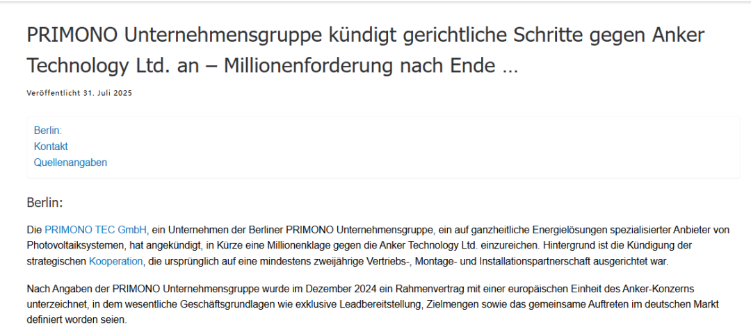 作为早期大卖之一的安克,其发展路上也是充满荆棘。就在上个月,德国光伏企业 Primono 就把安克创新告上了法庭,理由是安克这边未履行合同义务,同时还可能索赔金额高达数百万欧元。