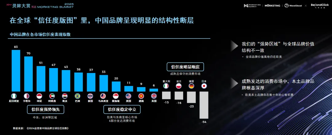 益普索2024年发布的《中国品牌全球信任指数》也证明了这一点。观察图片我们可以看到,中国品牌的信任度,从新兴市场到成熟市场,一路走低。新兴市场份额高,但市场价值密度低。真正高品牌价值的欧美成熟市场,则呈现信任度断崖。