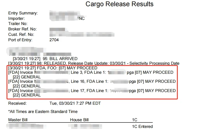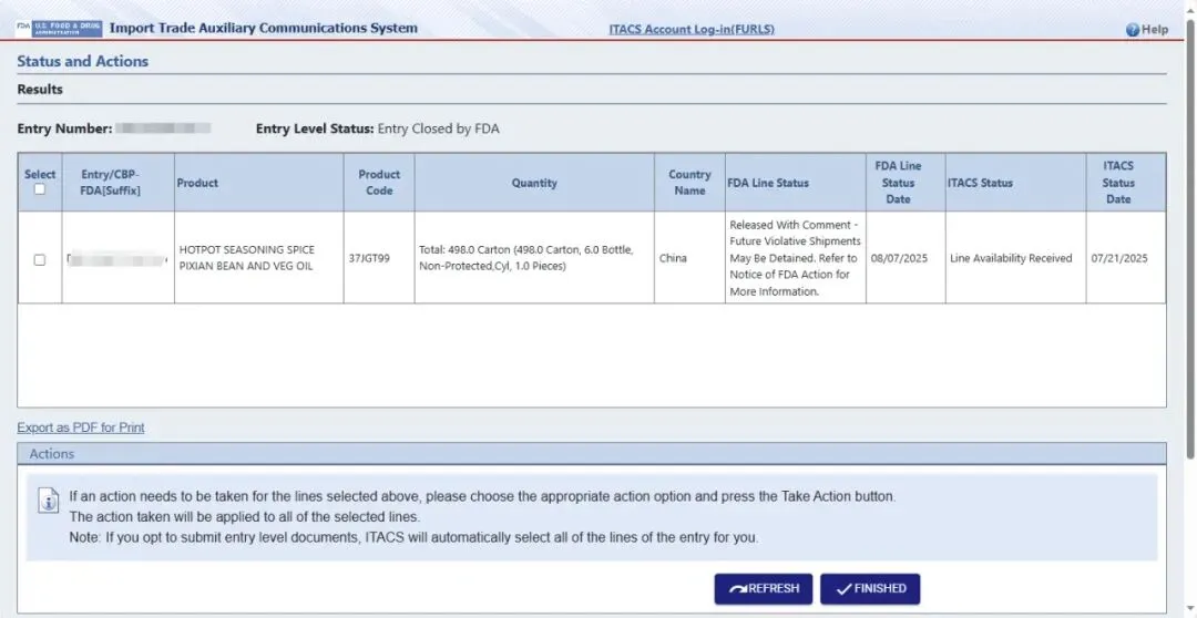 最新的 Entry 状态可通过 ITACS 查看,网址为 https://itacs.fda.gov。有关 Entry 状态或等待中的 FDA 检查(FDA exam)的更多信息,请联系入境口岸的 FDA 办公室(FDA office at the Port of Entry)。