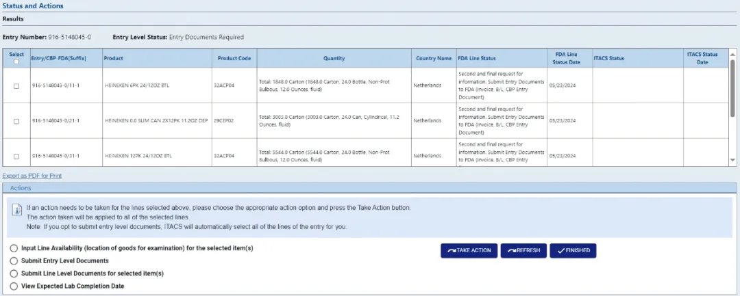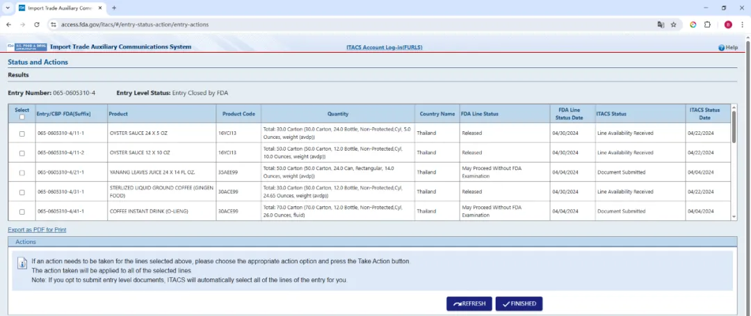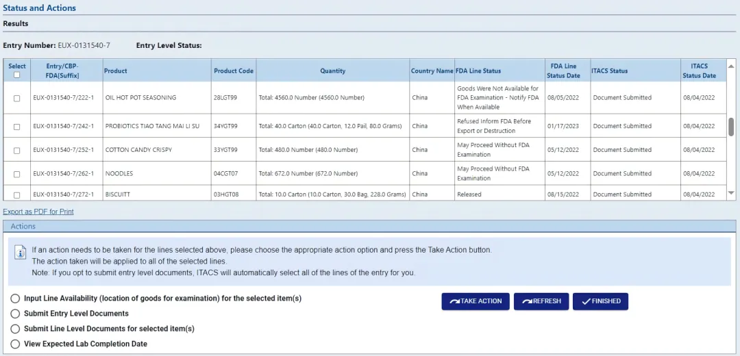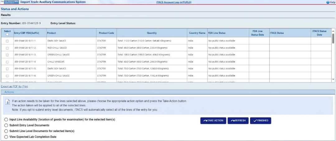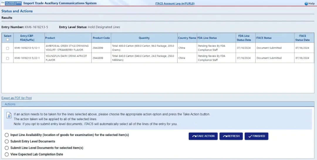 进口贸易辅助通信系统(ITACS)FDA Entry 状态查询,提交文件和可用性信息