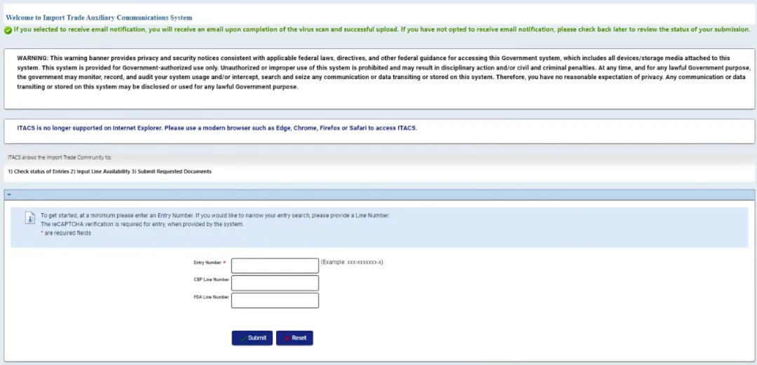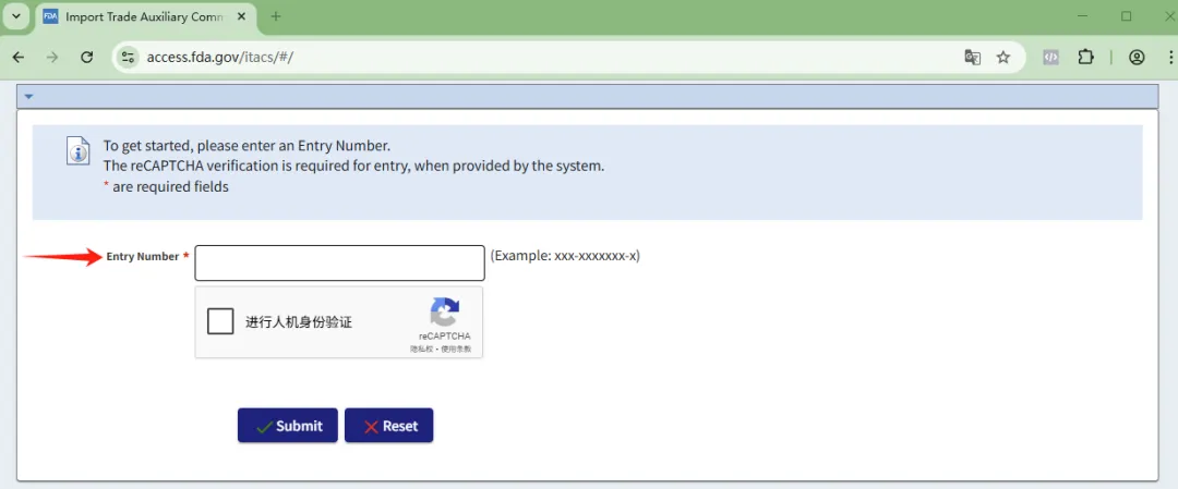 ITACS 基础功能(Basic functionality)可通过 https://itacs.fda.gov 网站访问,无需登录账户,只需提供已成功传输至 FDA 的有效的海关入境编号(Entry number)即可。