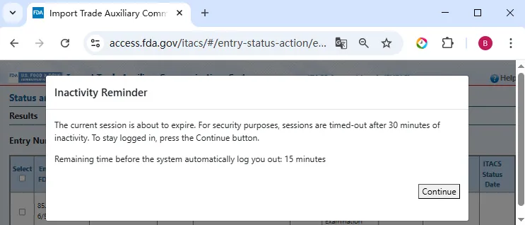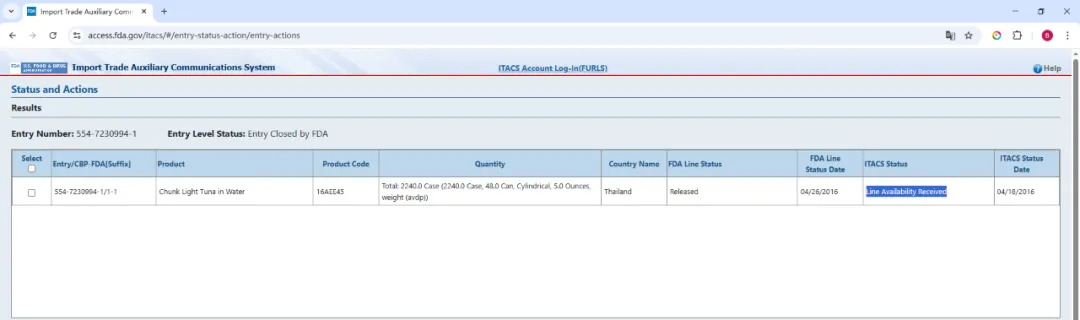 你可以在 FDA 的进口贸易辅助通信系统 ITACS(Import Trade Auxiliary Communication System)页面上使用你的入境编号(Entry number)来检查 Entry 状态。