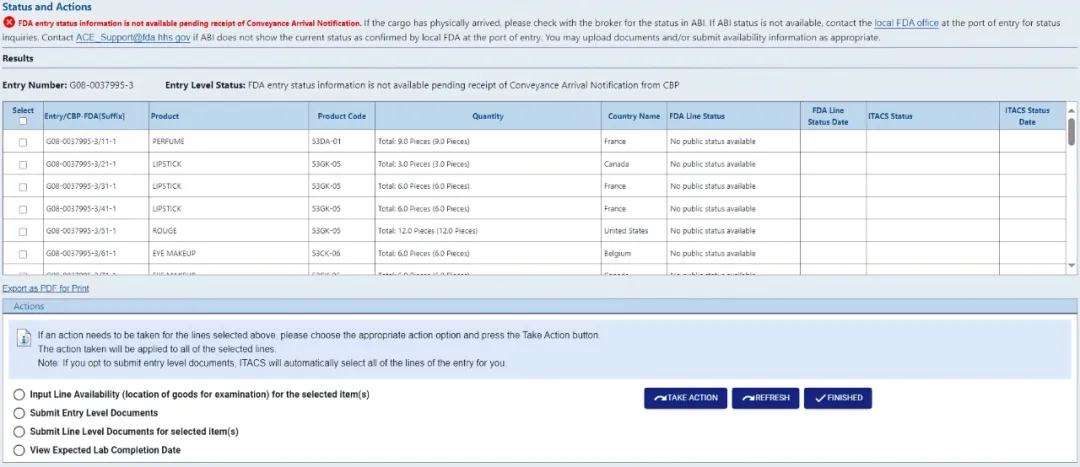 对于所有卡车和空运货物,ITACS 将显示此信息,只有在美国海关和边境保护局 CBP 将货物(Shipment)标记为已到达后,ITACS 才会提供有关卡车和空运货物的 Entry/Line 的状态信息。即使货物已经实际到达并收到有条件放行(Conditional Release),仍可能会收到此消息。CBP 可以在货物到达之前给予有条件放行。如果收到此消息,仍可以通过 ITACS 上传文件,以便 FDA 审查该 Entry。
