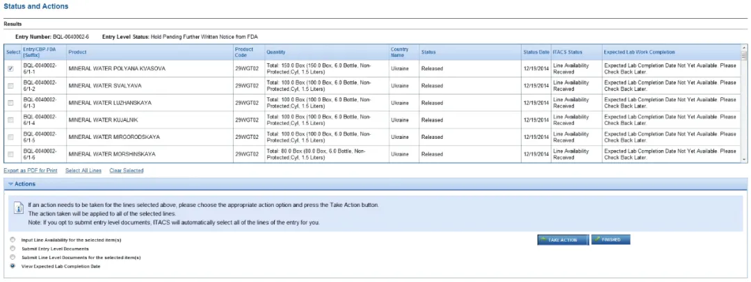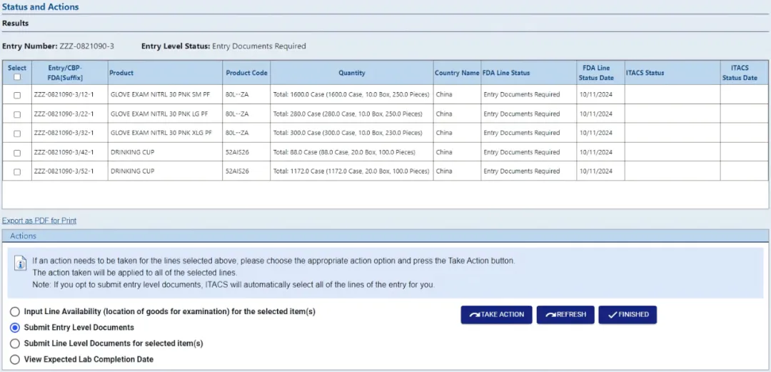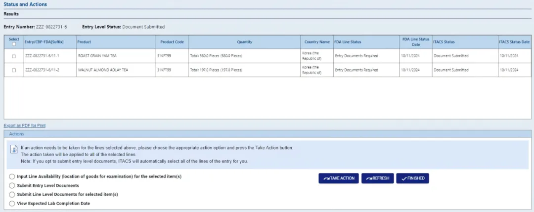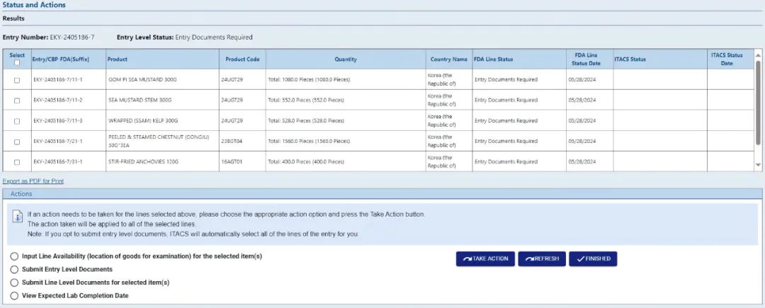 ITACS 可以快速查询已通过电子方式成功传输至 FDA 的 Entry 状态,