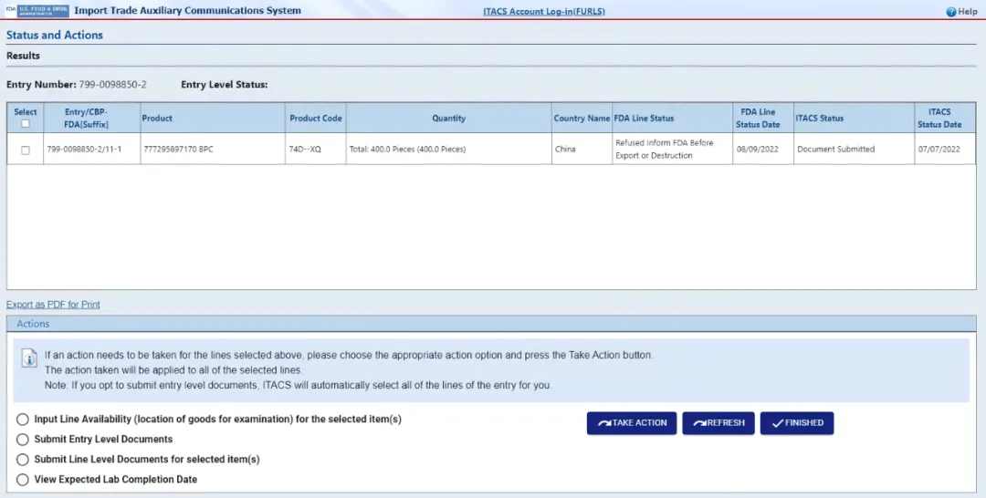 如果你的货物正在接受合规性审查(Under compliance review),请联系 FDA 行动通知(Notice of FDA Action)上列明的合规官员(Compliance Officer)。可通过 ITACS 系统获取 FDA 行动通知。