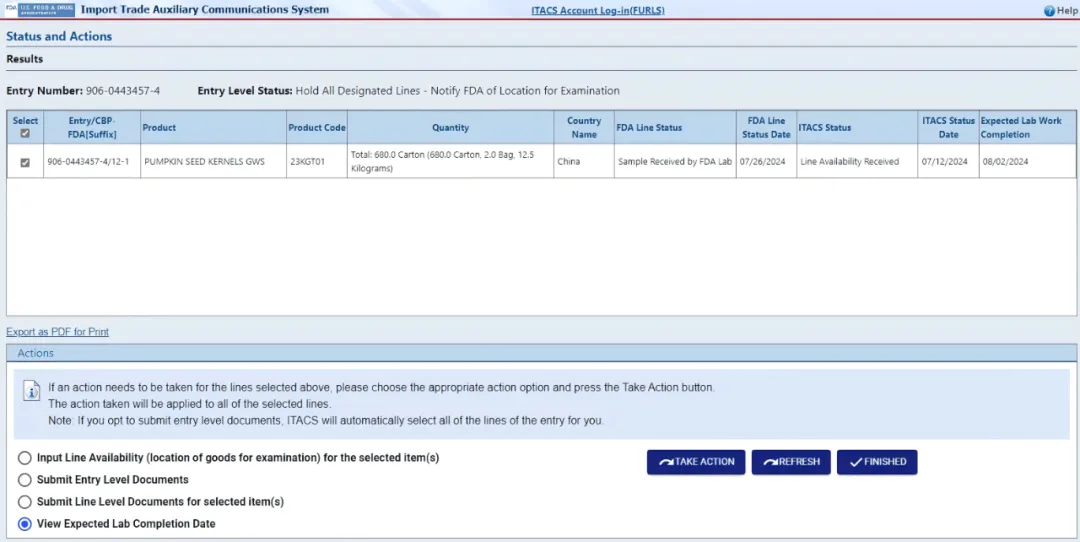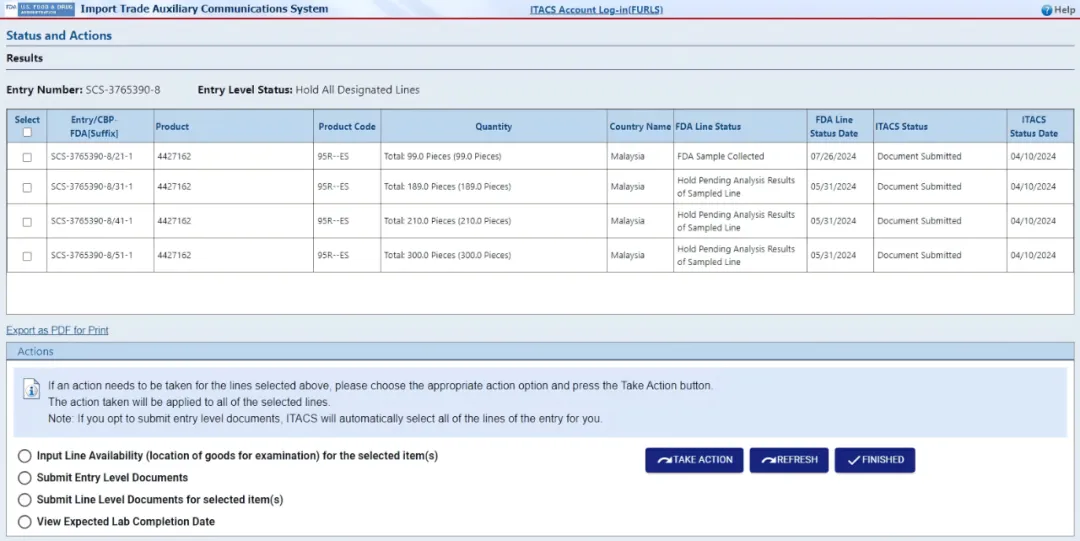 FDA Entry 状态:FDA 已采样(Sample collected by FDA),查看被采样 Line 的实验室处理时限(Viewing laboratory timeframes for sampled lines),