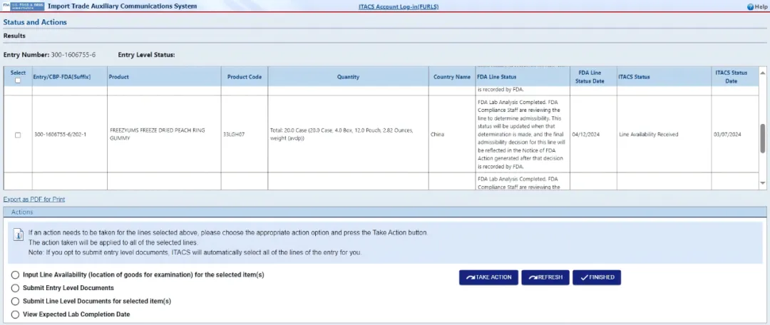 表明 FDA 实验室分析已完成,FDA 合规人员正在审查该 Entry Line 以确定其可接受性(Admissibility),该状态将在作出决定后更新,最终的可接受性决定将体现在 FDA 记录该决定后生成的 FDA 行动通知(Notice of FDA Action)中。