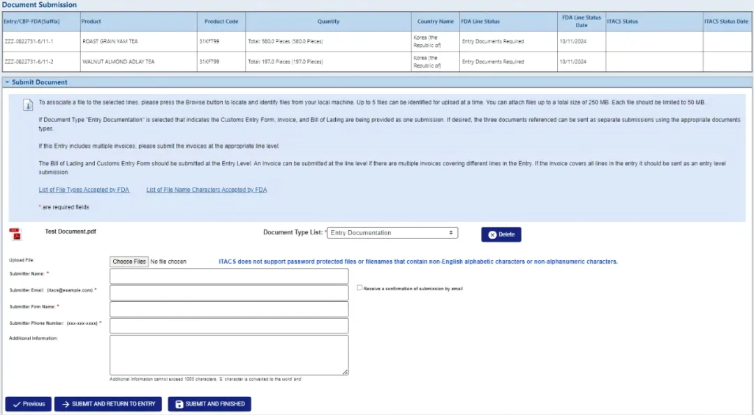 ITACS 不允许上传已被 FDA 关闭的 Entry 的文件。这表明 FDA 已针对该 Entry 的所有 Lines 做出了受理决定(Admissibility decisions)。