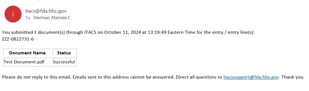 不可以,ITACS 电子邮件地址 (itacssupport@fda.hhs.gov) 是用于提供 ITACS 技术协助的。要通过 ITACS 提交文件,请访问 https://itacs.fda.gov。如果对具体的 Entry 有疑问,请联系入境口岸的 FDA 办公室(FDA office at the Port of Entry)。
