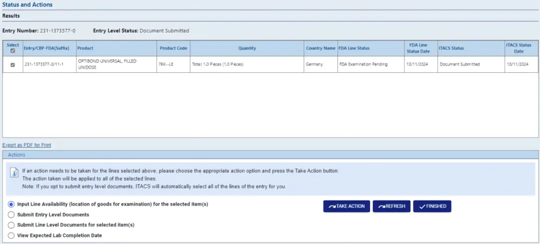 另外,只有当 Entry 至少一个申报行项 Line 已被 FDA 指定要进行实物查验/样品采集(Physical exam/sample)时,才可以提交可用性信息(Availability Information),