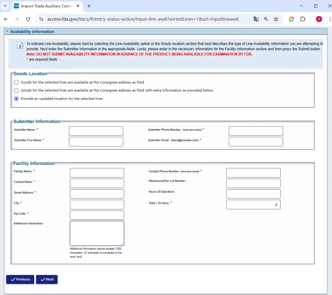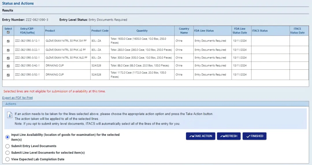 ITACS 仅允许提交已被 FDA 选中进行实物检查或抽样的 Entry Line 的可用性信息。否则,ITACS 将不接受有关商品可用性的信息。