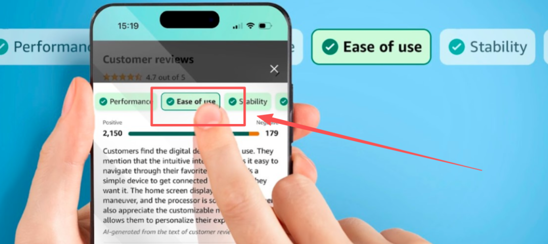 AI会提取买家最常提到的产品特点和使用感受,并生成一段客观、中立的总结。
