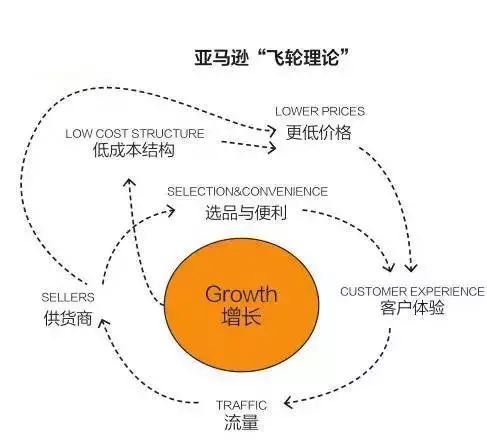 贝索斯与其助理团队描绘了公司步入良性循环的前景,他们相信这会成为公司发展的强大动力。公司的未来蓝图是这样的:以更低的价格来吸引更多的顾客。更多的顾客意味着更高的销量,而且也会把付给亚马逊佣金的第三方销售商更多地吸引到网站来。这也会使亚马逊从固定成本中赚取更多的利润,如物流中心和运行网站的服务器。更高的效率会使价格进一步降低。他们推断,任何一个飞轮只要运行顺畅,就会加速整个的循环过程。