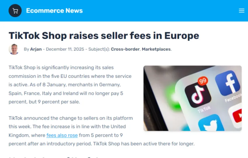 首先,TikTok Shop欧区发布了销售佣金上涨的通知,宣布自2026年1月8日起,欧盟五国(德国、西班牙、法国、意大利和爱尔兰)站点的平台佣金将从目前的5%上调至9%。在部分品类(例如电子产品)中,新费率可下调至7%。