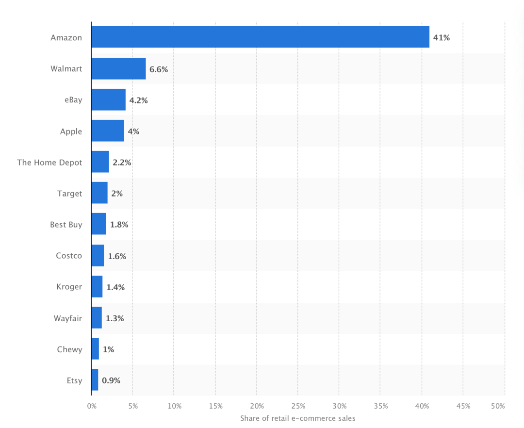 根据Statista提供到数据,亚马逊以41%的市场份额,占据美国电商平台市场占有率第一的排名。