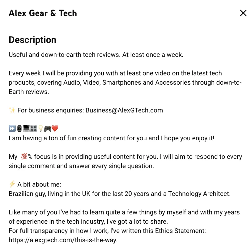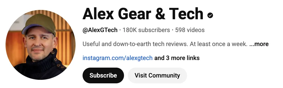 Alex Gear & Tech 本人长期生活在英国,职业背景是技术架构师,这也塑造了他内容中非常鲜明的个人气质:逻辑清晰、表达克制、不刻意迎合品牌。