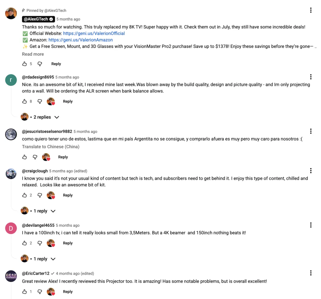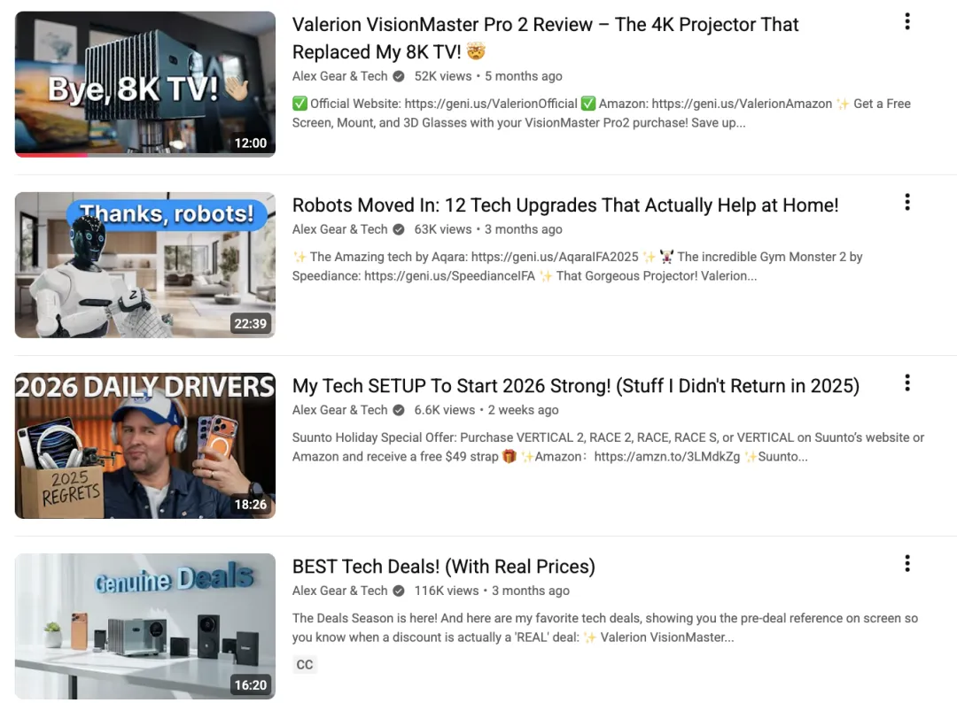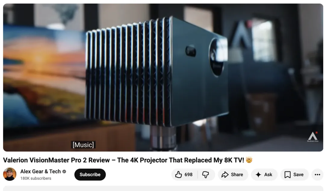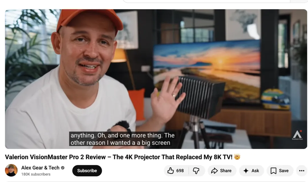 而在这一波合作中,来自英国的科技博主 Alex Gear & Tech脱颖而出。Alex并不走极客炫技路线,而是以“普通消费者视角”的深度评测见长,强调实际使用体验、购买建议和长期价值判断。对于定位中高端、主打家庭影音体验的 Valerion 来说,这种接地气、可信度高的表达方式,远比夸张的营销更容易打动海外用户,尤其是正在考虑替代电视、升级家庭娱乐系统的人群。