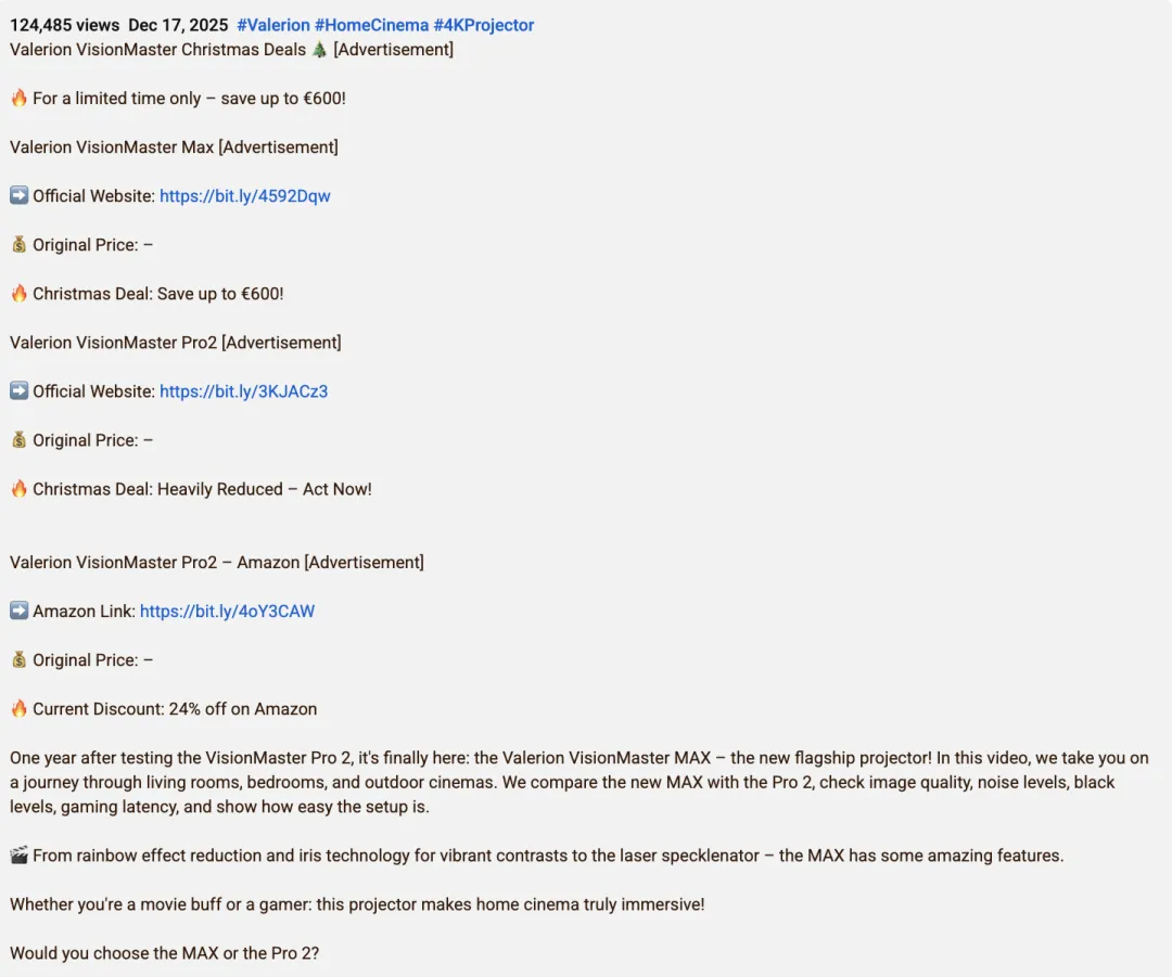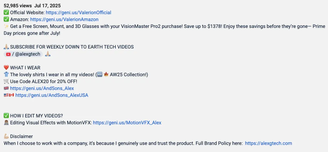 在视频描述和置顶评论中,Alex 明确放出了 Valerion 官方网站和 Amazon 链接,并强调赠送屏幕、支架和 3D 眼镜的捆绑信息,大幅降低了海外用户的下单门槛。