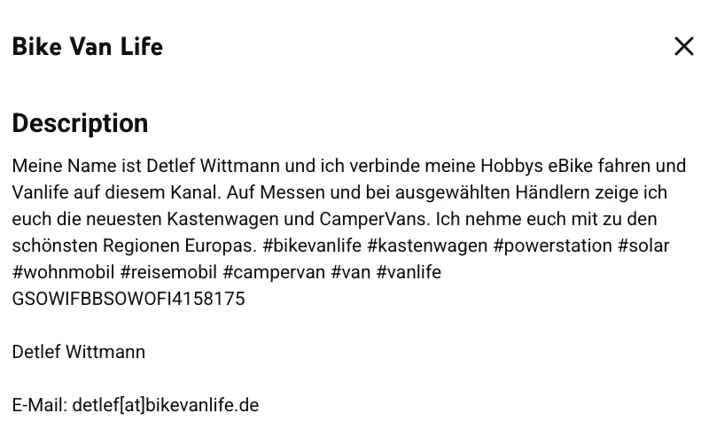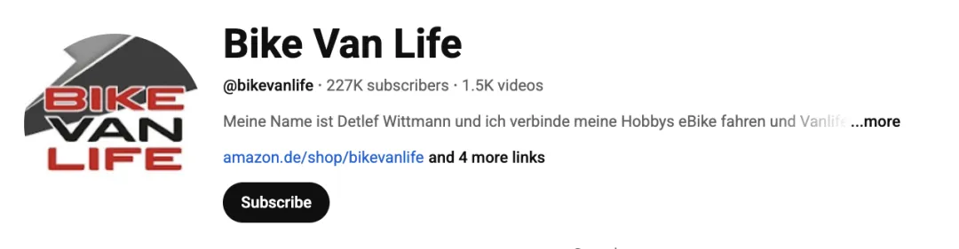 Bike Van Life 是德语区极具影响力的房车与露营类频道,订阅量约 22.7 万,长期深耕欧洲房车文化。
