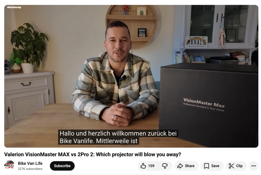 通过德语讲解、本地化语境和生活化测试,Valerion 被自然地植入到“房车生活升级方案”中,而不是一个突兀出现的电子产品品牌。