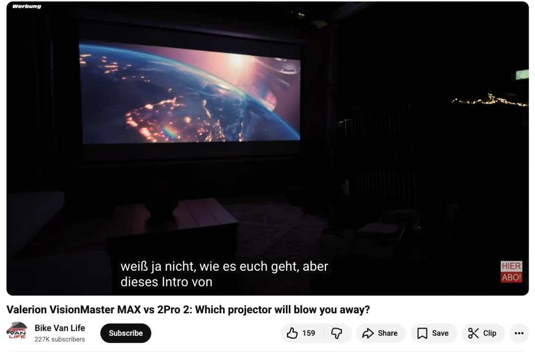 在这条合作视频《Valerion VisionMaster MAX vs 2Pro 2: Which projector will blow you away?》中,Bike Van Life 以对比评测的方式,同时测试 VisionMaster MAX 与 Pro 2,不仅在室内演示画质、噪音和音响效果,还把投影机带到车内与户外夜晚环境中实测,真实还原房车用户可能遇到的使用场景。